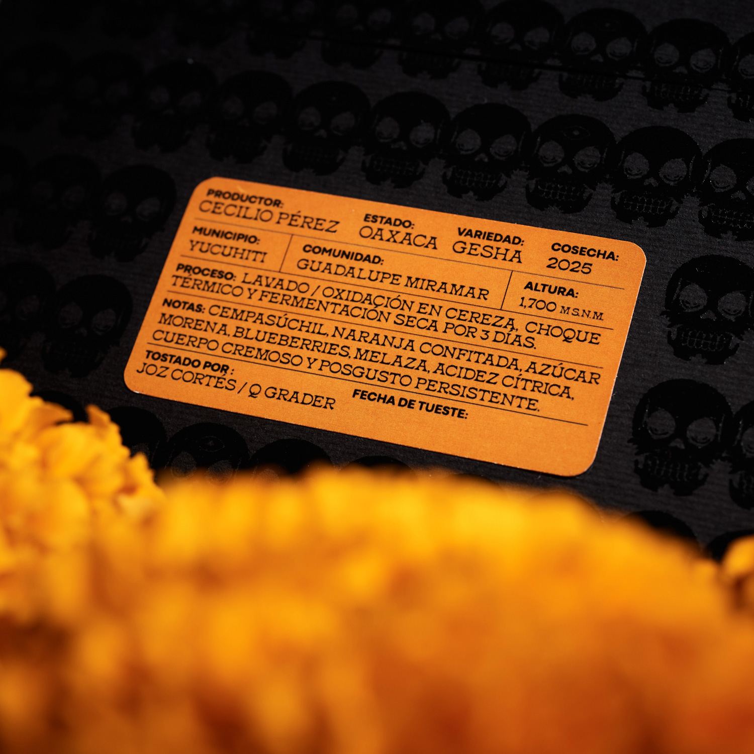 Características de sabor y olor del café (Notas): 🌼 Cempasúchil, naranja confitada, azúcar morena, blueberries, melaza, acidez cítrica, cuerpo cremoso y posgusto persistente 🌼